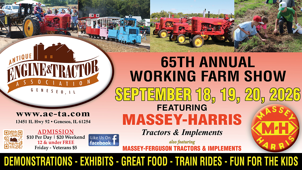 Since the first show in the Geneseo City Park, the club has grown to over 300 members and has expanded to 50 acres owned and another 15 acres of rented crop land. The big event each year is the annual three-day Working Farm Show, always the second weekend after Labor Day. During this show, the AETA harvest 40 acres of corn and soybeans with mid 1900’s equipment, thresh oats or wheat, run a saw mill, plow, dig potatoes, ride the train, and demonstrate gas engines as they were used from the early to mid-1900’s. The annual show gets bigger each year with hundreds of tractors, garden tractors and many gas engines, plus other agricultural memorabilia on the grounds. Every year the AETA features a different brand of antique tractor.